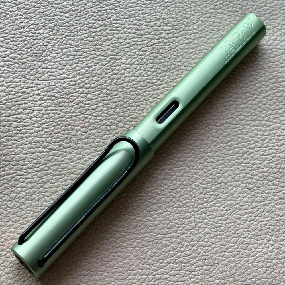 Lamy's signature pen in a striking anodized aluminum body finished in a beautiful silver green. It boasts the typical AL-Star features: durable aluminum construction, a translucent ergonomic grip, metal snap-cap, ink window, and Lamy’s recognizable springy clip