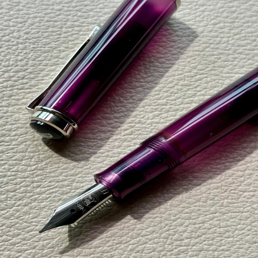 Color & Finish: The pen features a semi-transparent amethyst resin body and cap, allowing a view of the internal piston mechanism and ink level. This demonstrator-style design is complemented by silver-colored trim and Pelikan’s signature pelican-beak clip
