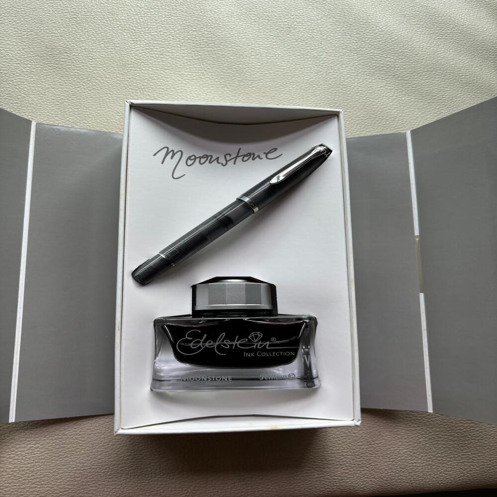 The Pelikan M205 Moonstone is a 2020 Special Edition fountain pen inspired by the moonstone gemstone, renowned for its ethereal shimmer and mystique. This pen features a semi-transparent, shimmering grey resin body that captures and reflects light, offering a subtle yet captivating sparkle. Its understated elegance makes it suitable for both professional settings and personal journaling.