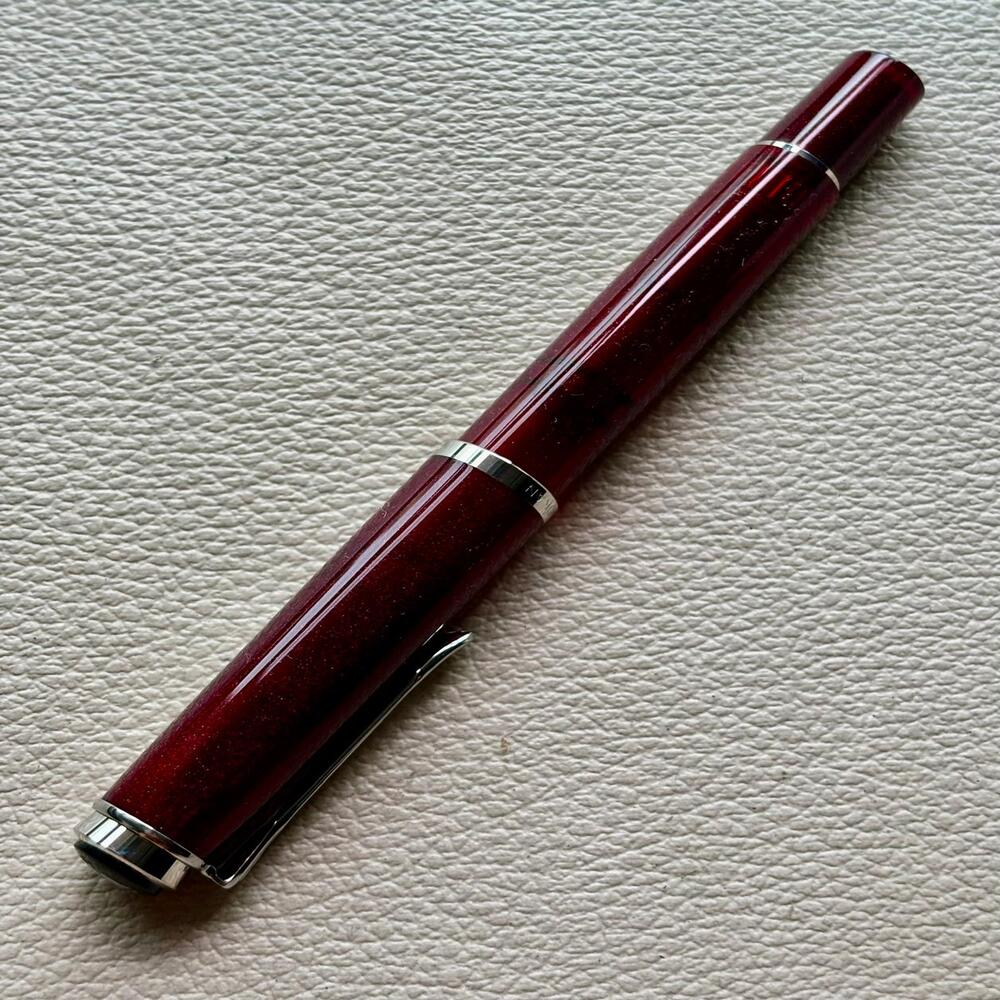 Color & Finish: The pen features a semi-transparent burgundy-pink resin body and cap, allowing a view of the internal piston mechanism and ink level. This demonstrator-style design is complemented by silver-colored trim and Pelikan’s signature pelican-beak clip