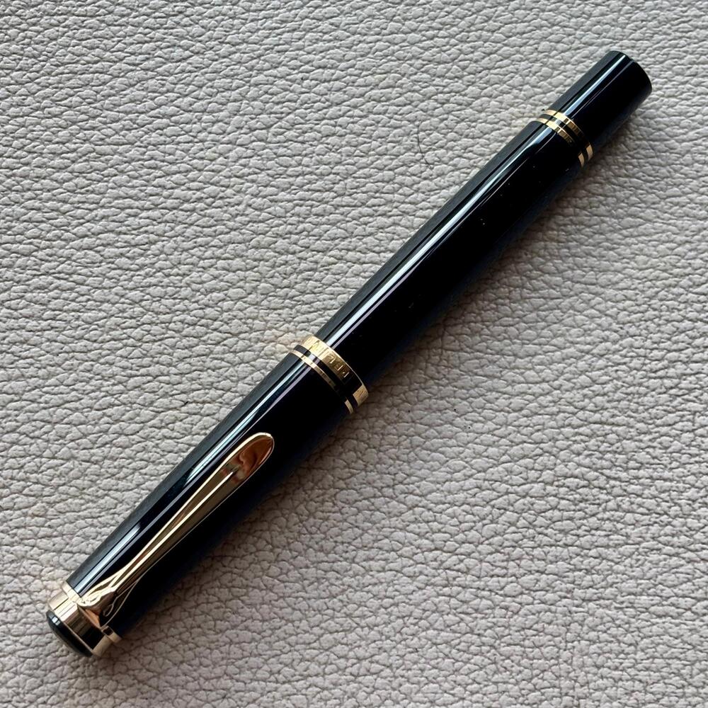 Barrel: Crafted from cellulose acetate with Pelikan's deep black pattern, complemented by a black cap and gold-plated trim.